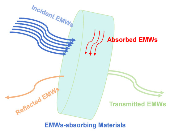 When microwaves interact with an absorbing material, their energy undergoes three fundamental transformation processes: reflection at the interface, absorption within the material bulk, and transmission through the medium (Figure 1), as described by classical electromagnetic wave theory [43]. The reflection behavior is primarily determined by the impedance mismatch between the material (Zin) and free space (Z0 ≈ 377 Ω), where the reflection coefficient scales inversely with the impedance matching degree. Optimal energy penetration occurs when the normalized material impedance (Zn = Zin/Z0) approaches unity, minimizing interfacial reflection and maximizing microwave absorption through bulk attenuation mechanisms [48,49]. The incident microwaves are subsequently attenuated through multiple microscopic energy conversion mechanisms (primarily to thermal energy), which constitute the fundamental working principle of microwave absorbing materials. The unabsorbed portion propagates as transmitted waves through the material thickness. For effective electromagnetic pollution control, the optimal microwave absorbing materials require simultaneous minimization of both reflection and transmission coefficients, achievable only through careful balancing of two critical material properties: (1) near-unity impedance matching (Zn ≈ 1) to maximize wave penetration, and (2) strong intrinsic dissipation capacity to ensure efficient energy conversion [50,51]. Typically, microwave absorption mechanisms are generally categorized into two fundamental types: magnetic loss and dielectric loss, which will be systematically discussed in subsequent sections [52].