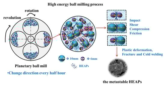 Schematic diagram of the synthetic mechanism of the planetary ball mill to form HEA powders. Reproduced with permission from [51], Copyright 2019, Elsevier B.V.