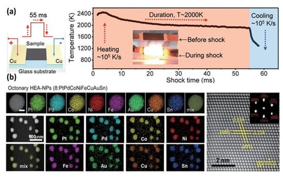 - Yao, Y.; Huang, Z.; Xie, P.; Lacey, S.D.; Jacob, R.J.; Xie, H.; Chen, F.; Nie, A.; Pu, T.; Rehwoldt, M.; et al. Carbothermal shock synthesis of high-entropy-alloy nanoparticles. Science 2018, 359, 1489–1494. [Google Scholar] [CrossRef] [PubMed]