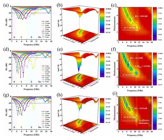 The diagram of the relationship between reflection loss, frequency, and thickness at different ball milling times: (a) 40 h; (d) 50 h; (g) 60 h; 3D reflection loss curves: (b) 40 h; (e) 50 h; (h) 60 h and the corresponding projection: (c) 40 h; (f) 50 h; (i) 60 h. Reproduced with permission from [100], Copyright 2023, Elsevier B.V.