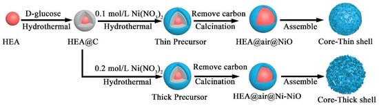 A schematic illustration for the synthetic process of HEA@air@NiO and HEA@air@Ni-NiO microspheres. Reproduced with permission from [103], Copyright 2019, Elsevier B.V.