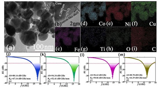 (a) TEM image of FeCoNiCuTi@C nanocapsules, (b) HRTEM image of a nanocapsule, (c–i) elemental mapping images. RL, ∆S, and RE of FeCoNiCuTi@C nanocapsules at some representative t. (j) 1.7 mm, (k) 1.8 mm, (l) 1.9 mm, and (m) 2.0 mm. Reproduced with permission from [106], Copyright 2022, Elsevier B.V.