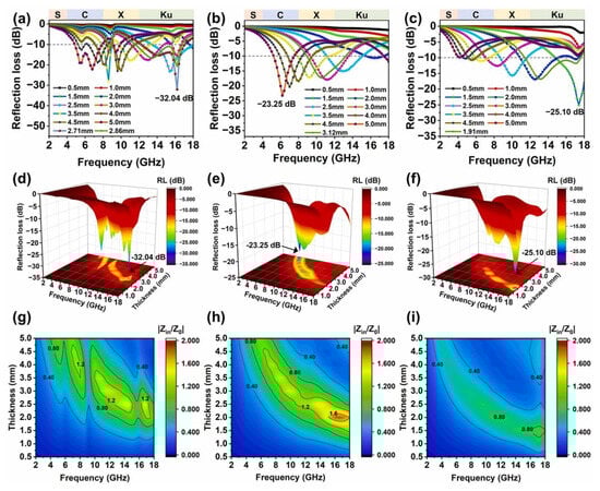 Two-dimensional RL curves: (a) HEO(1)-FeNi@PPy; (b) HEO(2)-FeCo@PPy; (c) HEO(3)-CoNi@PPy. Three-dimensional RL curves: (d) HEO(1)-FeNi@PPy; (e) HEO(2)-FeCo@PPy; (f) HEO(3)-CoNi@PPy. Impedance matching |Zin/Z0| contour plots: (g) HEO(1)-FeNi@PPy; (h) HEO(2)-FeCo@PPy; (i) HEO(3)-CoNi@PPy. Reproduced with permission from [108], Copyright 2024, Elsevier B.V.