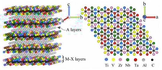 The crystal structure diagram of high-entropy MAX phase M5 (left plot) with Ti (blue), V (yellow), Zr (pink), Nb (green), Ta (red), Al (gray), and C (black) atoms and its M-C layer (right plot) with five elements uniformly distributed. Reproduced with permission from [113], Copyright 2023, AIP Publishing.