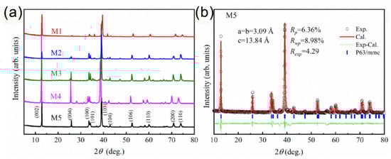(a) XRD patterns for all our prepared MAX phases; (b) the Rietveld refinement results for M5. The Rietveld simulated results (red line), experimental data (black circle), and the difference between the above two (green line), Bragg positions of phases included for refinement (blue markers). Reproduced with permission from [113], Copyright 2023, AIP Publishing.