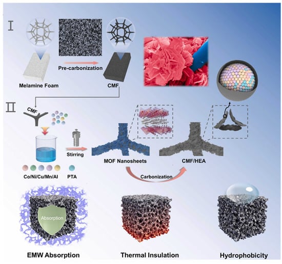 - Gang, S.; He, H.; Long, H.; Wei, Y.; Zhang, W.; Li, X.; Qian, Y.; Luo, Y.; Yang, J. 2D-high entropy alloys embedded in 3D-carbon foam towards light-weight electromagnetic wave absorption and hydrophobic thermal insulation. Nano Energy 2025, 135, 110642. [Google Scholar] [CrossRef]