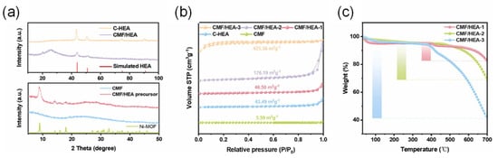 (a) XRD patterns of CMF, CMF/HEA precursor, (b) C-HEA, and CMF/HEA. (c) BET surface area of CMF, C-HEA, CMF/HEA-1, CMF/HEA-2, and CMF/HEA-3. (c) TG curves of CMF, C-HEA, CMF/HEA-1, CMF/HEA-2, and CMF/HEA-3 with a heating rate of 10 °C min−1 in Ar. Reproduced with permission from [117], Copyright 2025, Elsevier B.V.
