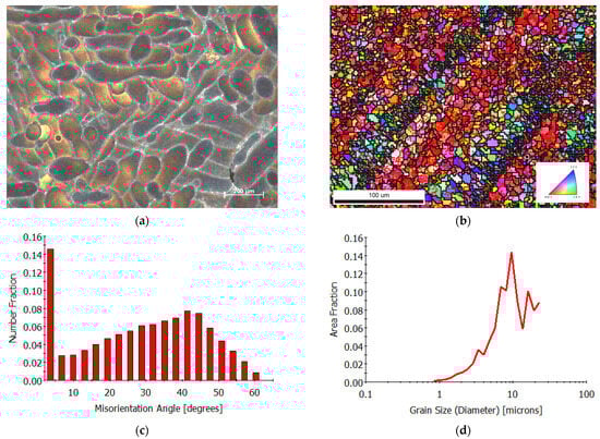 Hierarchical microstructure of the as-built PBF-LB/M AlSi10Mg alloy in the X-Y build plane: (a) Optical micrograph revealing the characteristic discontinuous melt pools resulting from the laser scan strategy, which includes a 67° rotation between successive layers; (b) large-area EBSD inverse pole figure (IPF) map showing a bimodal distribution of equiaxed grains. Larger grains are visible in the scan track interiors, while finer grains are concentrated at the melt pool (scan track) boundaries. Red lines—LAGBs, black lines—HAGBs; (c) histogram of grain boundary misorientation distribution; (d) histogram of grain size distribution.
