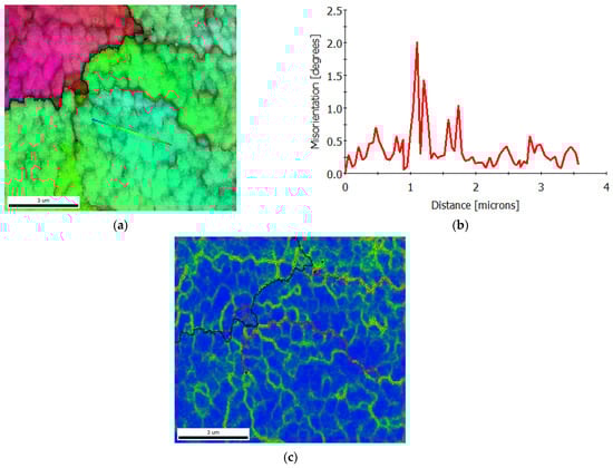 (a) High-resolution IPF-EBSD map resolving the fine cellular substructure within a grain, characterized by very low misorientation angles between adjacent cells. Red lines—LAGBs, black lines—HAGBs; (b) results of the point-to-point misorientation along the “rainbow” line visible in (a); (c) KAM map revealing the concentration of geometrically necessary dislocations (GNDs) along the cellular walls.