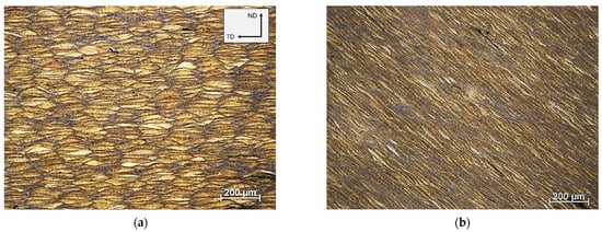 Light microscope images illustrating the microstructural state of the AlSi10Mg alloy sample after a first (a) and second pass (b) using the ECAP die with a 30-degree twist outer channel. The cumulative effect of two passes through this specific die, imposing both shear and continuous torsional strain, leads to a further advanced and distinct microstructural evolution. It should be noted here that the second pass was conducted via Route Bc, which involves a billet rotation of 90 degrees after the first ECAP pass. The vertical and horizontal axes of the figure correspond to the normal direction (ND) and transverse direction (TD), respectively.