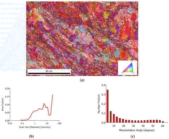 The histogram of grain boundary misorientation, presented in Figure 5c, reveals that low-angle grain boundaries (LAGBs) constitute 63% of the boundary population. This prevalence of LAGBs signifies that the microstructure exists in a non-equilibrium state, characterized by a high density of dislocation substructures and subgrains that have not yet fully evolved into new grains delineated by HAGBs [37]. Such a condition is characteristic of an intermediate stage of severe plastic deformation, occurring before the microstructure reaches a steady-state condition that is typically associated with a higher HAGB fraction.