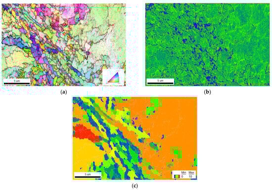 Figure 5a presents the inverse pole figure (IPF) map referenced to the sample’s normal (Z) direction, which utilizes a color code (see the inset in the right corner of the image) to visualize the spatial distribution of crystallographic orientations. The alignment of the microstructure is approximately 45°, which is in good agreement with the light microscopy observations. The IPF-Z map reveals a highly heterogeneous microstructure composed of a sheared, elongated substructure alongside regions of fine, probably dynamically recrystallized (DRX) grains. It is also visible that the original grains have been severely deformed, as significant intragranular color gradients are visible. These gradients indicate substantial lattice distortion and the formation of extensive dislocation substructures, a common feature of plastically deformed metals.