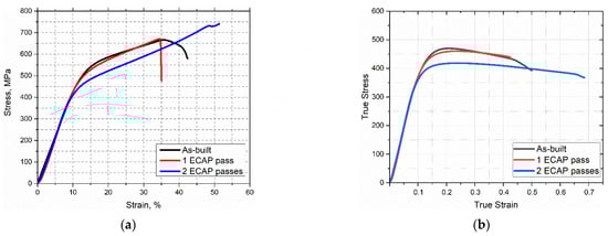 Following a single ECAP pass at 150 °C, the material exhibits a slight enhancement in its mechanical properties. The YS increases by approximately 7% to 482 MPa, with the UCS reaching 682 MPa. This strengthening is attributed to the combined effects of increased dislocation density and significant grain refinement induced by the severe plastic deformation. The newly created grain and subgrain boundaries act as effective obstacles to dislocation motion. The true stress–strain curve for this condition shows pronounced strain hardening up to a peak stress of ~480 MPa, after which flow softening becomes dominant, similar to the as-built state. This initial hardening capacity is slightly enhanced, as quantified by an increase in the strain hardening exponent (n) to 0.27.