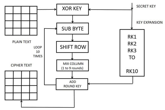 AES is a block cipher technique that uses fixed, 128-bit data and variable-length keys. The state, a two-dimensional array of bytes with four columns and four rows, is responsible for AES’s basic operations. AES’s round function performs four unique data transformations: substitution bytes, row shifting, column mixing, and round key addition. The AES method is iterative, repeating ten, twelve, or fourteen times depending on the key length. A block diagram of the AES algorithm is presented in Figure 1.