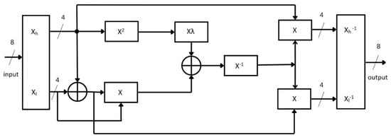Isomorphic mapping is used to transform from to using composite field arithmetic. This changes the basis of the finite field to simplify calculations. Galois fields of , and can be expressed as the following Equations (3)–(5) to describe the construction of composite Galois fields used to simplify arithmetic in AES implementations. These equations follow the method proposed in [,].