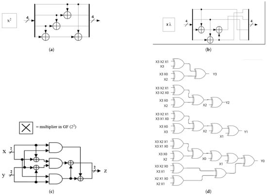 (a) Squaring circuit; (b) 4-bit multiplier with (c); multiplier in (d); multiplicative inverse in GF().