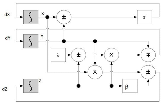 where , , and are present-state outputs that depend on previous states with feedback effects. Figure 6 depicts block diagram of Lorenz chaotic key generator.