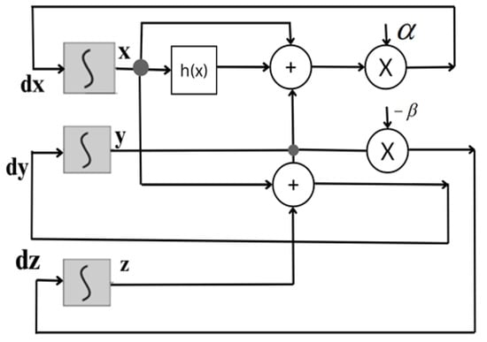 Simpler circuitry using piecewise-linear elements (op-amps, capacitors, resistors) makes Chua’s circuit easy to implement on hardware. This circuit is highly nonlinear due to piecewise-linear characteristics and can be easily tuned for different chaotic behaviors. This exhibits richer bifurcation and multi-scroll attractors, supporting more complex key sequences. This chaotic key is more controllable and synchronizable for chaos-based communication systems. It offers better statistical properties in some scenarios like NIST randomness tests and autocorrelation and provides lower power due to piecewise-linear operations and fewer multipliers. The differential equations of Chua’s system are given with outputs, which are expressed in Equation (12). Figure 7 depicts a block diagram of the Chua chaotic key generator.
