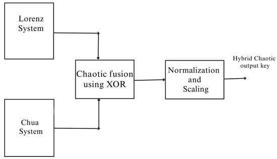 Combining both Chua and Lorenz chaotic keys leverages Chua’s tunability and Lorenz’s sensitive dynamics, enhancing security further. The Chua circuit block generates chaotic outputs xc, yc, and zc using Chua’s equations. The Lorenz system block generates outputs xl, yl, and zl using the Lorenz attractor. Chaotic fusion combines Chua and Lorenz outputs using methods where nonlinear mixing combines both Lorenz and Chua keys in the XOR method (for bit sequences). Normalization and scaling converts floating-point chaotic values to key streams in the required format. By combining four independent chaotic variables (xL, yC, zL, zC) from two distinct systems (Lorenz and Chua), the output becomes a mixture of highly nonlinear and sensitive trajectories. This XOR-free fusion ensures that key entropy is maximized while reducing periodicity. A block diagram of the hybrid Lorenz–Chua key generation is depicted in Figure 8.