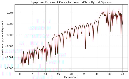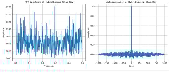 The plot showcases the butterfly-shaped structure, demonstrating the system’s sensitive dependence on initial conditions and chaotic behavior. Due to the fusion of both chaotic systems, higher entropy, better key sensitivity, and increased unpredictability can be achieved. For certain parameter values, , , and , the system exhibits deterministic chaos, meaning that small changes in initial conditions result in vastly different trajectories. The system does not settle into a stable state but instead moves in a strange attractor, appearing as a butterfly-shaped structure in phase space. The periodicity condition of a hybrid Lorenz–Chua system depends critically on the system parameters and can be determined via Lyapunov exponents, phase space, or spectral analysis. When these parameters force the system’s trajectories to repeat, periodicity is achieved typically at low nonlinearity levels or near bifurcation points.
