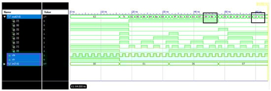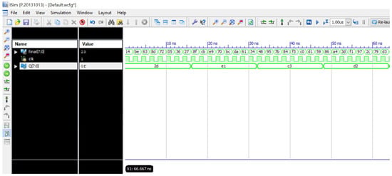 where A(x) is an affine mapping function, M is an invertible matrix, and N is a vector. Affine transformation plays a major role in the S-box, which provides necessary properties of security, such as nonlinearity and resistance to attack. It ensures that the S-box is resistant to linear and differential cryptanalysis, which enhances cipher security. Affine transformed output y[7:0] is obtained by using given Equation (9).