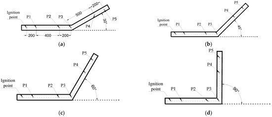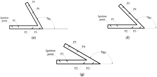 In this investigation, seven distinct turning angles—30°, 45°, 60°, 90°, 120°, 135°, and 150°—were integrated into the pipeline configuration, as illustrated in Figure 2. The positions of the pressure transducers are depicted in Figure 2a: P1 is located 200 mm downstream from the ignition source; P2 is positioned 200 mm upstream of the bend apex; P3 is located at the bend apex, which is defined as the intersection of the centerlines of the straight and inclined sections; P4 is situated 500 mm downstream from the bend apex; and P5 is placed 200 mm further downstream from P4. To ensure the reliability and statistical significance of the experimental results, each set of experiments was conducted three or more times. Following established scientific statistical principles, three sets of valid data were retained for each angle as the final experimental dataset.