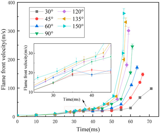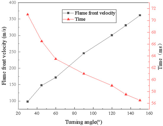 Through experimentation, a substantial amount of data pertaining to explosion flame imagery and explosion pressure was collected. The explosion flame image data were systematically organized to extract relevant information regarding the velocity of the explosion flame front at various time intervals. A curve depicting the flame front velocity of the gas–coal dust coupling explosion as a function of time was generated, as illustrated in Figure 3. Additionally, the time required for the explosion flame to propagate from the ignition point to the outlet of the pipeline was measured, and a curve representing the maximum flame front velocity as a function of the turning angle was plotted, as shown in Figure 4.