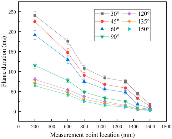 The duration curve of the explosion flame under various turning angles is presented in Figure 5. Analyzing the curve reveals that the duration of the explosion flame within the curved pipeline exhibits a discernible pattern. From the coal dust laying point to the outlet of the test pipeline, the duration of the explosion flame gradually decreases. Specifically, notable differences in the duration of the explosion flame are observed at different turning angles. As illustrated in Figure 6, the explosion flames at turning angles of 30°, 45°, 60°, 90°, 120°, 135°, and 150° all exhibit the longest durations at the coal dust laying point, measured at 240.5 ms, 224.67 ms, 191.5 ms, 115 ms, 79.67 ms, 71.33 ms, and 64.17 ms, respectively. Conversely, the shortest durations recorded at the pipe outlet are 18.5 ms, 13 ms, 7.33 ms, 5.67 ms, 3.83 ms, 3 ms, and 2 ms. Overall, it is evident that as the turning angle changes, the duration of the explosion flames within the pipeline follows a specific trend: larger turning angles correlate with shorter overall durations of the explosion flames.