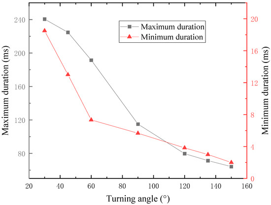 In conducting a comprehensive analysis of explosive flames, the duration of the explosion flame serves as a crucial analytical indicator. In the pipeline section prior to the coal dust laying point (200 mm from the left ignition point), the low brightness of the explosion flame poses challenges for analysis. Observations indicate that this segment does not significantly affect the overall distribution of flame duration within the pipeline. Therefore, this section focuses on the segment extending from the coal dust laying point to the outlet of the pipeline. By organizing the image data of the explosion flame, the duration data for the gas–coal dust coupling explosion flame at various positions along the pipeline were extracted. Utilizing these data, curves representing the duration of the explosion flame under different turning angles were plotted, as shown in Figure 5. Additionally, curves illustrating both the maximum and minimum durations of the explosion flame within the pipeline as a function of the turning angle were generated, as depicted in Figure 6.