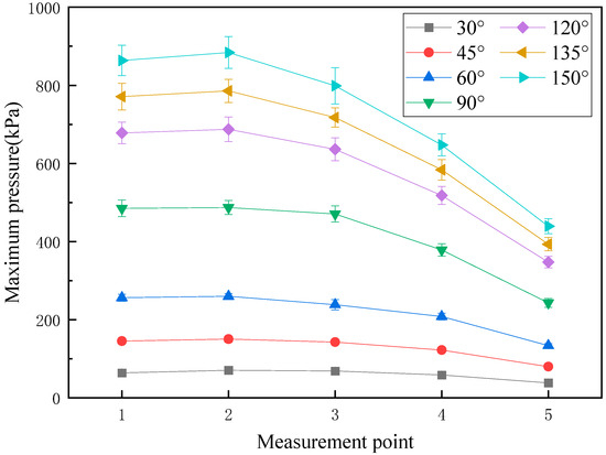 Figure 7 illustrates the maximum pressure distribution curve of the shock wave overpressure generated by the coupling explosion of gas and coal dust in pipelines with varying turning angles. The analysis reveals that the overpressure distribution patterns in pipelines at turning angles of 30°, 45°, 60°, 90°, 120°, 135°, and 150° exhibit notable similarities. Specifically, in the straight section preceding the pipeline’s turn, the shock wave overpressure remains relatively stable, with only a slight decrease observed near the turning point. Following the transition through the turning section, the overpressure value experiences a rapid decline until it reaches the outlet of the pipeline. A detailed numerical analysis indicates that at a turning angle of 30°, the overpressure values at each measuring point are relatively low, with sensor 2 recording a maximum overpressure value averaging 7.07 kPa. As the turning angle increases to 150°, the maximum overpressure value at the same measuring point significantly rises to 88.40 kPa, while the overpressure values at various positions within the pipeline show a general increasing trend. Notably, regardless of variations in the turning angle, the peak overpressure consistently occurs at the location of sensor 2 before the turn. This finding suggests that this specific area is most significantly influenced by geometric changes and turbulence effects.