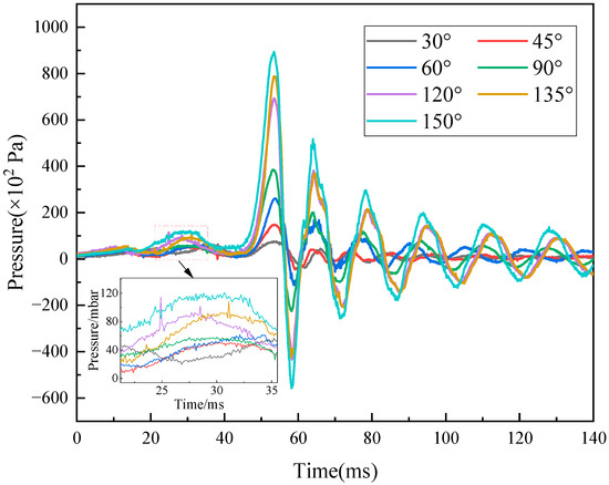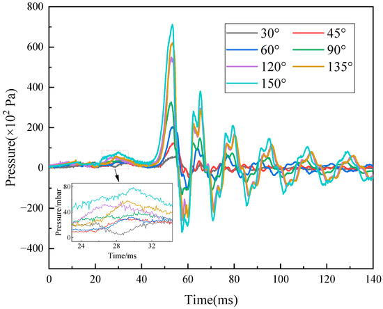 To investigate the influence of the pipeline’s turning structure on explosion shock wave overpressure, this section analyzes the variations in shock wave overpressure in the upstream and downstream regions adjacent to the turning section. Pressure data from sensors 2 and 4, which are positioned before and after the turning angle, respectively, are selected for this analysis. The temporal changes in pressure data recorded by sensors 2 and 4 are presented in Figure 8 and Figure 9, respectively.
