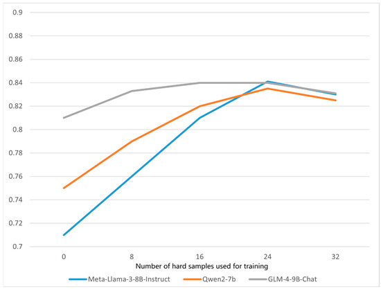 Meta-Llama-3-8B-Instruct-LoRA (without hard-sample mining and prompt module): Both the prompt module and the hard-sample mining strategy are removed. LoRA fine-tuning is applied only on the original training set to verify LoRA’s effectiveness without external strategy interventions.