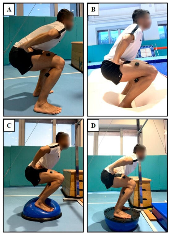 Isometric parallel squats were conducted on all surfaces (Figure 1). Two sets of isometric squat exercises were performed on each surface, with each set lasting 10 s. The exercises were performed with body weight. Prior to the exercises, a general warm-up was performed, consisting of 5 min of running followed by 2 min of walking, as well as 5 repetitions of squats, respectively. A 3 min rest period was provided after the warm-up.