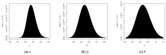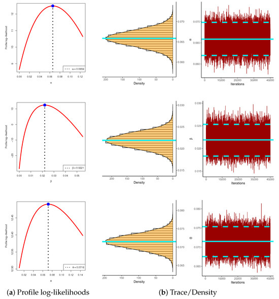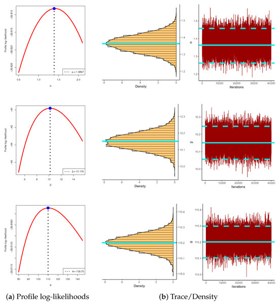 Using the complete datasets A and B, in addition to complete sample, two TIIC samples are also considered with sizes and for Data A, and and for Data B. Maximum likelihood and Bayesian methods are employed to obtain point estimates and interval estimates for the parameters , , and from all censored samples. The MLEs and Bayesian estimates (along with their Std. Errs) as well as the interval widths (IWs) derived from 95% ACI-NA/ACI-NL and 95% BCI/HPD approaches for , , and are summarized in Table 10 and Table 11. For all Bayesian computations, due to the lack of prior knowledge about , the hyperparameters and () are set to , making the gamma priors nearly non-informative. The M–H algorithm is employed with a burn-in period and a total of iterations. To assess the existence and uniqueness of the MLEs for , , and , the corresponding profile log-likelihood functions are plotted in Figure 7 and Figure 8. These plots display clear and well-defined maxima, confirming that the frequentist estimates of , , and derived from all samples based on datasets A and B exist and are unique. These graphical findings align with the numerical estimates reported in Table 10 and Table 11, and thus these estimates are used as initial values for subsequent Bayesian computations. Additionally, Figure 7 and Figure 8 present the kernel density estimates (using a Gaussian kernel) alongside trace plots for the 40,000 retained MCMC samples of , , and obtained from a representative TIIC sample () for both datasets A and B. The trace plots for each parameter indicate good mixing and suggest convergence of the chains. Moreover, the marginal posterior estimates of , , and appear approximately symmetric. These observations further confirm that the chosen burn-in period is sufficient to mitigate the influence of initial values and allow the chains to adequately explore the target posterior distributions.