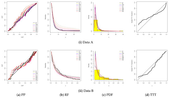 Figure 6 visualizes the model fits for the IH distribution and its competitors using real datasets A and B, evaluated through four graphical diagnostics: (i) probability–probability (PP) plots, (ii) fitted reliability function (RF) curves, (iii) fitted PDF curves overlaid with histogram-normalized counts (HNC), and (iv) scaled total time on test (TTT) transforms.