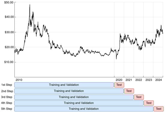 To assess the generalization ability of the proposed model and to avoid overestimating performance due to fortuitous predictions, we adopted a walk-forward validation strategy with an expanding window approach. In the initial step of the walk-forward procedure, data from 2010 to 2019 (10 years) were used for training. The year 2020 was reserved as the first test set. In each subsequent iteration, the training window was expanded by one year: 2010–2020 for predicting 2021, 2010–2021 for 2022, and so on. This process was repeated five times, resulting in five disjoint out-of-sample test periods totaling 1302 trading days for robust model evaluation. The daily silver price per ounce chart and expanding window frames used in this study are shown in Figure 1.