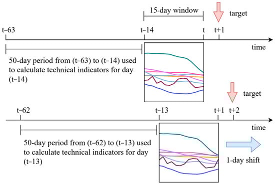 For each of the 15 days within this window (from t − 14 to t), we calculated 10-, 20-, 30-, 40-, and 50-day SMAs and Bollinger bands. To compute the 50-day SMA for the earliest day in the window (t − 14), access to price data from t − 63 onwards is required. Consequently, a total of 64 consecutive past days (from t − 63 to t) were used to construct each image. Since 50-day SMA needed to be calculated for each day, in order to create the graphical image of 1 January 2010, 63 days of data between 6 October 2009 and 31 December 2009 were included in the dataset. The goal was to predict the direction of the price movement on day t + 1 using only past data, thereby ensuring a strictly causal structure and eliminating any risk of data leakage.