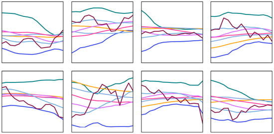To visually encode these technical patterns, each chart was constructed using solid lines. All visualizations were rendered on a white background to ensure high contrast and consistency across samples. To preserve visual priority and enable the detection of key chart structures, such as short-term SMAs crossing long-term ones or the narrowing of indicator bands, the plotted lines were drawn in a deliberate order: the upper and lower Bollinger bands were rendered first, followed by the 50-, 40-, 30-, 20-, and 10-day SMAs, with the closing price placed last. We would like to note that the middle Bollinger band was not explicitly drawn, as it is mathematically equivalent to the 20-day SMA. Each line was assigned a unique hexadecimal color code: #404BE3 for the upper Bollinger band, #217B7E for the lower Bollinger band, #EDA323 for the 50-day SMA, #8DA8DF for the 40-day SMA, #FD4299 for the 30-day SMA, #C06DF8 for the 20-day SMA, #87AEDC for the 10-day SMA, and #741B47 for the closing price. These colors were selected carefully to ensure that all RGB channels contained nonzero values. While the specific color choices were not semantically meaningful, they were intended to distribute visual variation across channels and prevent any channel from being empty or redundant. All colors and line placements were applied consistently across all samples to ensure visual coherence and reproducibility.