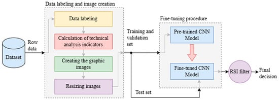 In our proposed algorithmic silver trading model, the RSI is used to support the forecasts made by fine-tuned CNN models, thus improving profitability by eliminating erroneous forecasts. In this study, the final buy–sell signal forecasts of proposed algorithmic silver trading model were generated according to Algorithm 1. The overall schematic of the proposed model is shown in Figure 4.