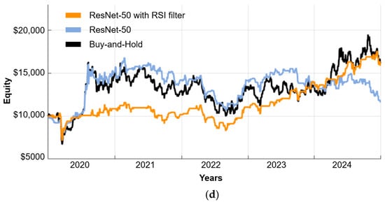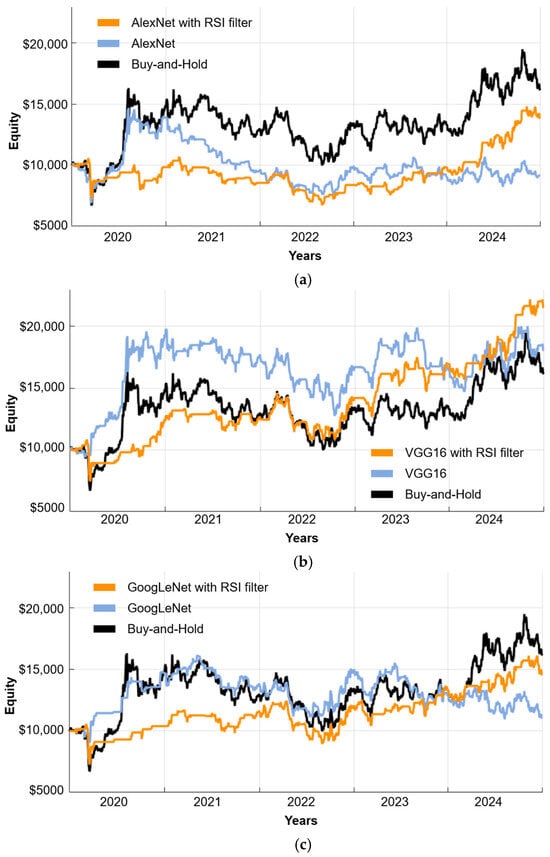 Notably, although the RSI indicator alone did not yield a profitable strategy (Sharpe ratio: 0.08; Avg. annual return: 1.72%), integrating the RSI as a filter with CNN-based models consistently improved key performance metrics. For instance, the VGG16 model’s Sharpe ratio increased from 0.34 to 0.68, and the cumulative return improved from 80.63% to 115.03% when RSI filtering was applied. Similarly, other CNN architectures showed increased Sharpe ratios and reduced drawdowns with RSI integration (see Table 3). These quantitative results provide clear empirical evidence that RSI filtering helps reduce erroneous trade signals, enhancing the overall robustness and profitability of the proposed model.