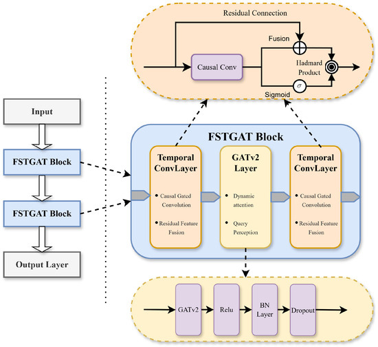 - GATv2: GATv2 (Graph Attention Network v2) [30] is an improved version of the traditional Graph Attention Network (GAT), and the core innovation is to solve the “masking bias” problem of the attention mechanism in the original GAT. Traditional GAT applies masks to invisible nodes (e.g., non-neighbor nodes) when calculating the attention weights, which leads to bias in the attention calculation process. GATv2, on the other hand, by redesigning the calculation of the attention mechanism, makes the model no longer rely on masks when calculating the attention weights, so that it can deal with all the nodes in a fairer way, and improves the model’s expressive and generalization abilities. This optimization builds on advanced graph attention techniques, enhancing spatial relationship modeling in FSTGAT.The core operation of GATv2 is represented as follows:where and represent the feature vectors of nodes i and j, is a learnable weight matrix, and represents the attention mechanism.