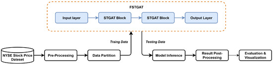 Figure 2 illustrates the stock price analysis pipeline using the Financial Spatio-Temporal Graph Attention Network (FSTGAT). The NYSE stock price dataset is preprocessed, including feature extraction, normalization, and graph structure construction, then split into training and test sets. The training set is processed through an input layer, stacked FSTGAT blocks, and an output layer for model training. The test set undergoes inference, followed by post-processing, enabling model evaluation and visualization to achieve spatio-temporal correlation-driven stock prediction.