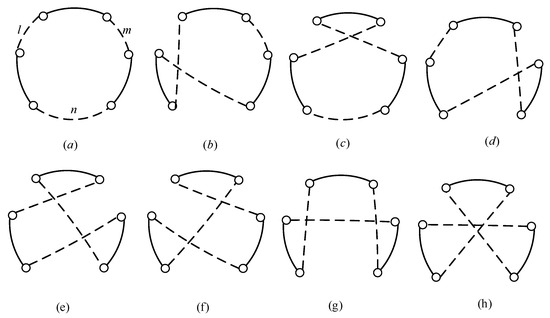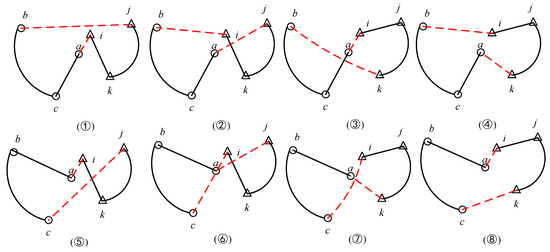 Suppose the closest pair of points is , where a is a point in cluster , is a point in cluster j, b and c are the adjacent points before and after a, and j and k are the adjacent points before and after . Based on different edge disconnection strategies, the following eight connection methods are designed (other points in the loop are omitted), as shown in Figure 3: