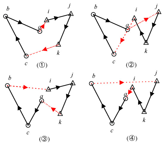 In the ATSP, since the loops generated by the ABIA are directional, the designed connection scheme must consider directionality constraints. Cluster can disconnect either the ac or ba edge and can also disconnect either the ij or ki edge. By disconnecting one edge from each pair, a connection method is determined. Therefore, there are a total of four connection methods, as shown in Figure 4: ①②③④.