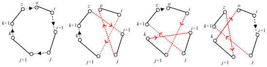 Inspired by the 3-opt optimization approach, the complete TSP loop is divided into four continuous path segments using three splitting points (in conjunction with the starting point), as shown in Figure 5. Here, let o be the starting point of the loop, and i, j, and k represent the three key splitting points. The loop can then be divided into the following four path segments.