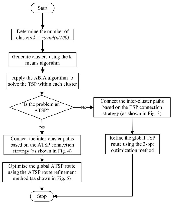 In this work, the k-means clustering algorithm [34] is employed to partition the point set, with each resulting small-scale TSP subproblem solved using the ABIA. Subsequently, inter-cluster connection rules are constructed to link multiple TSP tours. To accommodate the structural differences between TSP and ATSP, distinct inter-cluster connection strategies are designed accordingly. After the inter-cluster tour is formed, a post-processing phase is applied, incorporating the 3-opt algorithm [35] along with a set of custom-designed path refinement rules, to mitigate the risk of convergence to local optima.