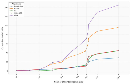- The cumulative deviation of the k-ABIA-3opt was 66.95% lower than that of the k-ABIA, clearly demonstrating the effectiveness of local search strategies applied after clustering. Additionally, the cumulative deviation of k-ABIA was 49.23% lower than that of the original ABIA, confirming that the clustering–connection strategy significantly improves solution quality.