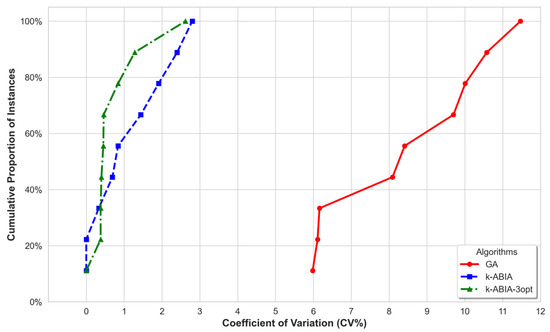 - In Figure 7, the k-ABIA-3opt curve is concentrated near the left (low CV), with 80% of its CV values below 1%. Both k-ABIA-3opt and k-ABIA kept CV values under 3% across all instances, reflecting strong stability.
