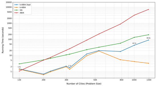 In this subsection, ten TSP instances ranging from 100 to 1300 cities were selected for evaluating the computational efficiency of the algorithms. Since the AACO-LST paper did not report runtime, only k-ABIA-3opt, k-ABIA, GA, and ABIA were compared. The results are shown in Table 5, and the runtime trend with increasing problem size is illustrated in Figure 10. The key findings are summarized as follows: