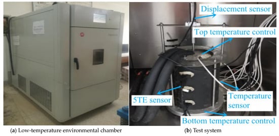 Frozen soil is a special type of soil (rock) with temperatures at or below 0 °C and containing ice [1,2]. Due to the existence of porous ice in frozen soil, the physical and mechanical properties of the soil are very sensitive to the influence of the external environment and climate. A series of complex physical and mechanical processes occur between frozen soil and structure foundations when the soil is subjected to the loads of the upper structures, leading to frost heaves, thawing, and other disasters [3,4,5].
